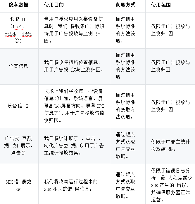 AdSet SDK会调用其他SDK ,表为其他SDK隐私内容及隐私链接。