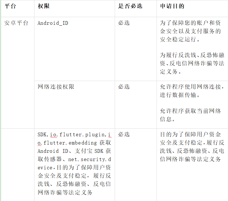 权限:设备号(IMEI号)、设备码(IMSI码)、IP地址、Android ID(安卓唯一设备ID)、中国移动UAID(仅限安卓设备)、OAID(仅限安卓设备)、UUID(仅限iOS设备)